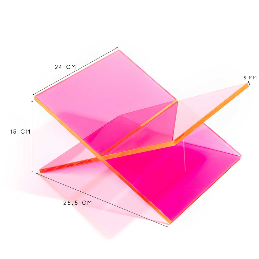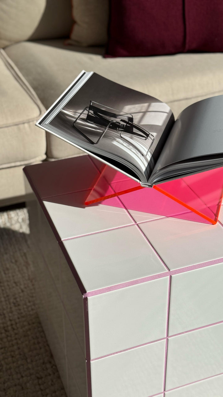 Deze moderne boekenstandaard is een echte blikvanger. Het kleurrijke acrylglas vangt het licht en werpt speelse reflecties door de ruimte, waardoor hij niet alleen functioneel is, maar ook sfeer toevoegt aan je interieur. Of je nu een vrolijk kleuraccent zoekt of juist een statement wilt maken in een rustige, neutrale ruimte: deze standaard past perfect. Hij biedt een stevig en stijlvol podium voor koffietafelboeken en kookboeken. Gemaakt van hoogwaardig, breukbestendig acrylglas en met een draagkracht van 8–10kg is deze boekenstandaard geschikt voor zelfs de zwaarste boeken.