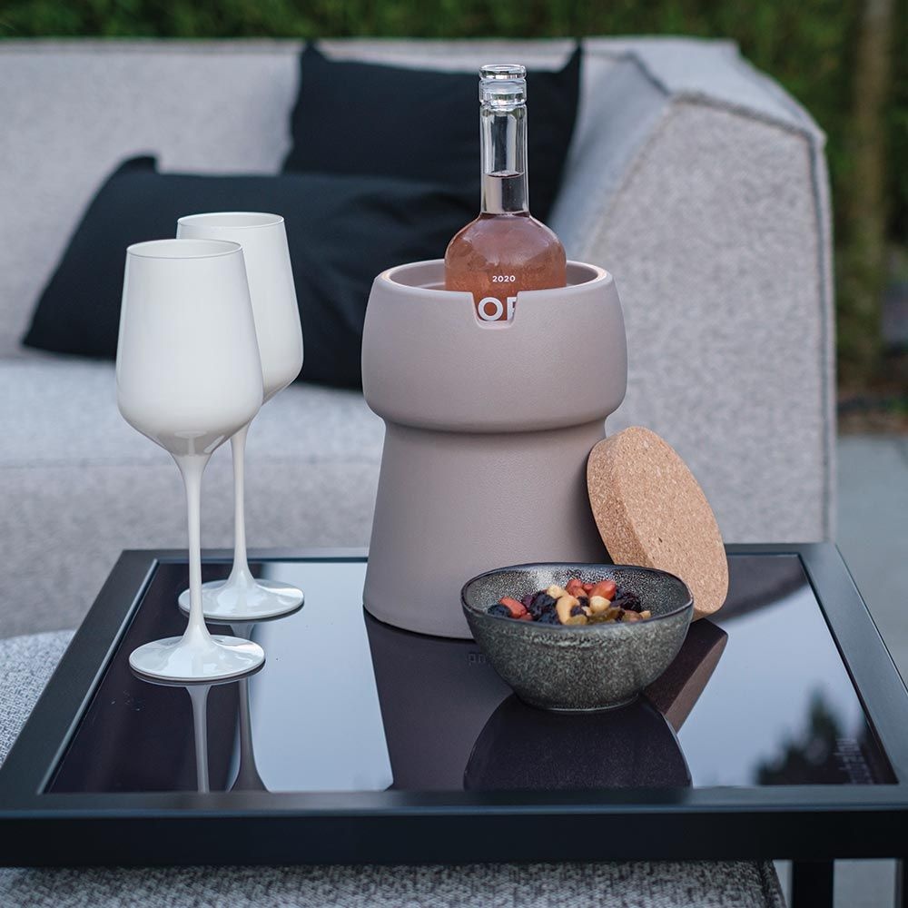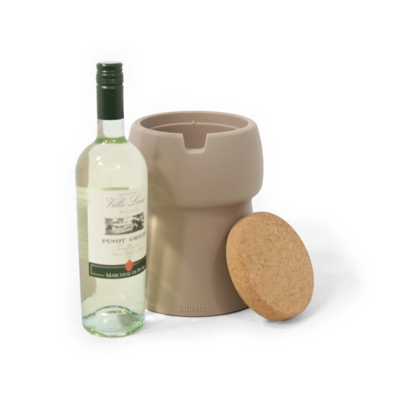 De 1-bottle Champ is beschikbaar in drie kleuren. De top is van kurk. Door de weerbestendige materialen kan je de wijnkoeler zelfs het hele jaar buiten op je terras of op je balkon laten staan. Maar binnen in je keuken of eetkamer staat de wijnkoeler ook erg goed!