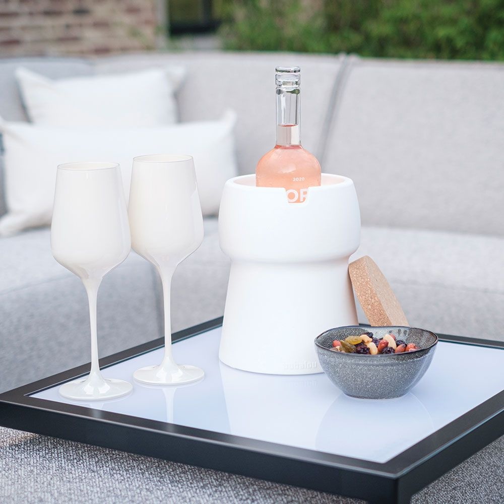 De 1-bottle Champ is beschikbaar in drie kleuren. De top is van kurk. Door de weerbestendige materialen kan je de wijnkoeler zelfs het hele jaar buiten op je terras of op je balkon laten staan. Maar binnen in je keuken of eetkamer staat de wijnkoeler ook erg goed!