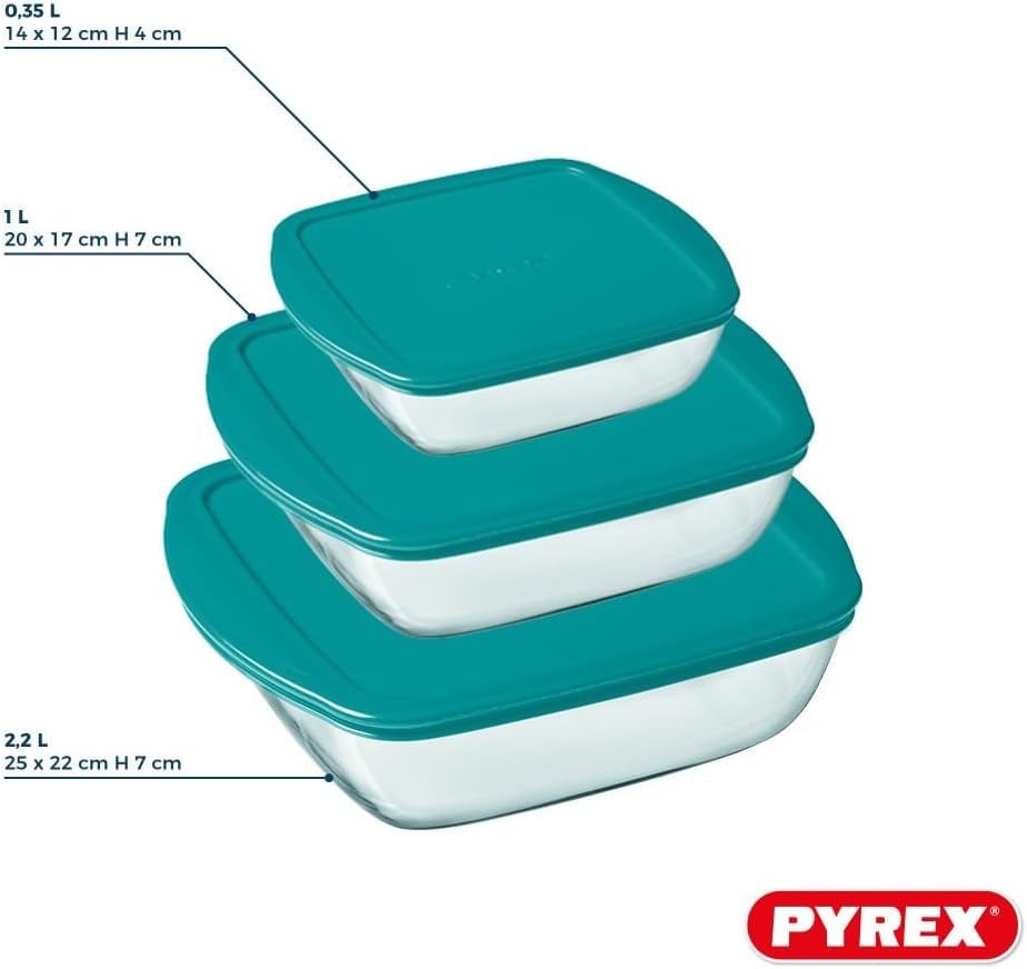 Soepen, sauzen, veloutés, salades... Bewaar ze snel en gemakkelijk met behulp van onze set van 3 vierkante Pyrex® glazen schaaltjes. Een assortiment van 3 maten, 0,35L, 1L en 2,2L, ontworpen om al je lekkerste zelfgemaakte gerechten in te bewaren en in te vriezen. Dankzij de transparantie van het glas kun je in de gaten houden hoe je gerechten garen en hoe lang ze houdbaar zijn, maar je kunt ze ook elegant in het midden van de tafel serveren.