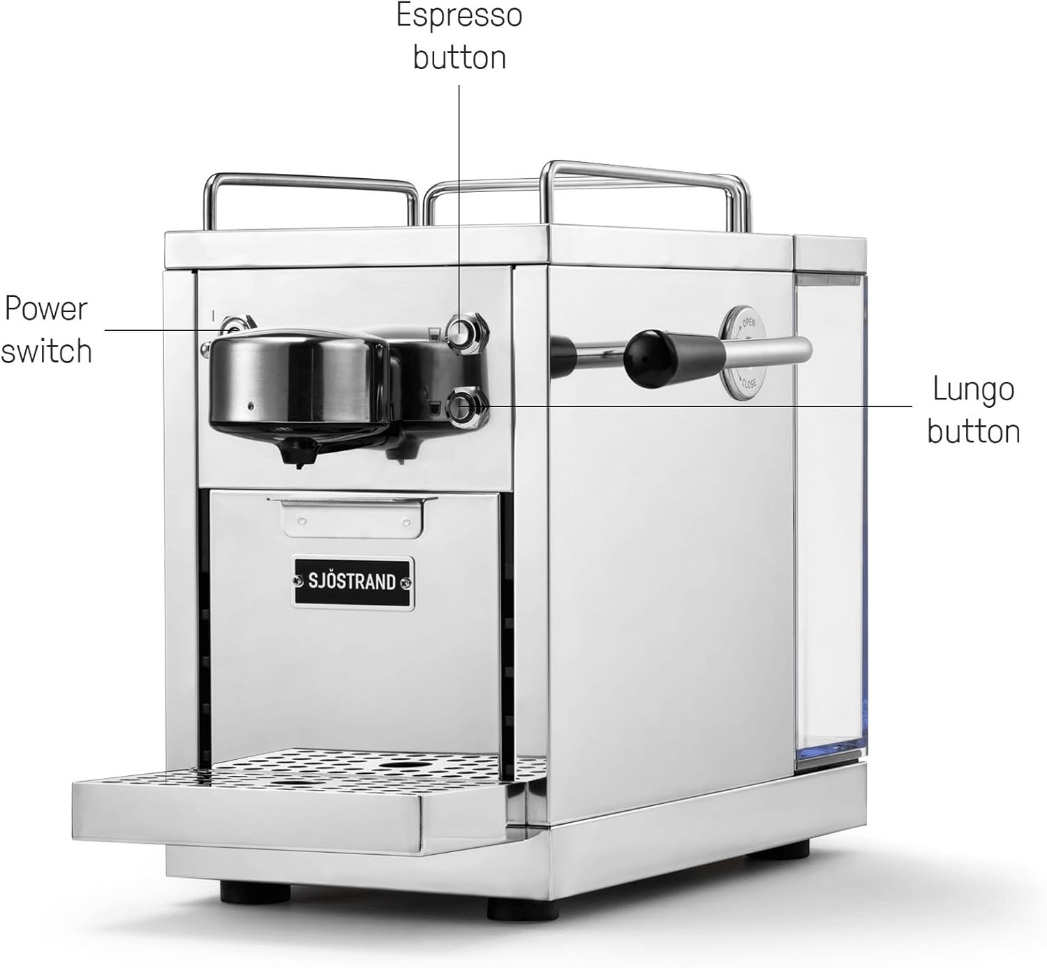 Sjöstrand The Original is een stijlvolle Nespresso®-compatibele koffiecapsulemachine met een hoogwaardige roestvrijstalen behuizing, een minimalistisch Scandinavisch ontwerp en een gepolijste chroomafwerking. Het slanke Zweedse ontwerp, het duurzame materiaal en de duurzaamheidsaanpak vallen gemakkelijk in de smaak. De machine maakt gebruik van een constante temperatuur en nauwkeurig waterverbruik voor een perfecte extractie van smaken en aroma's. Het is de ideale mix van stijl en functionaliteit.