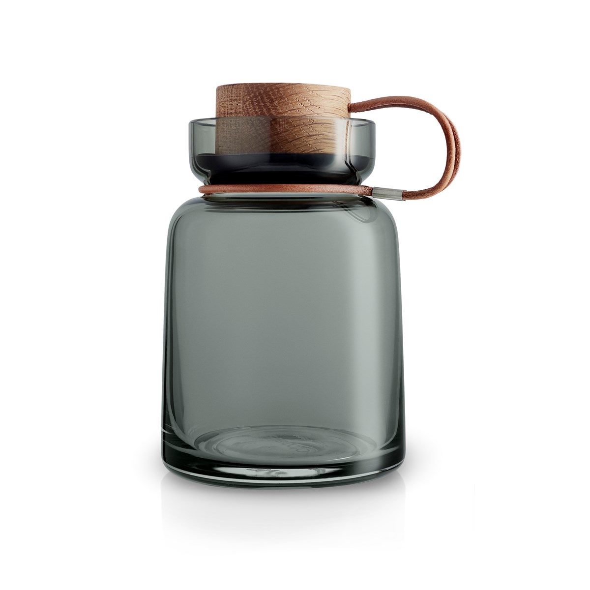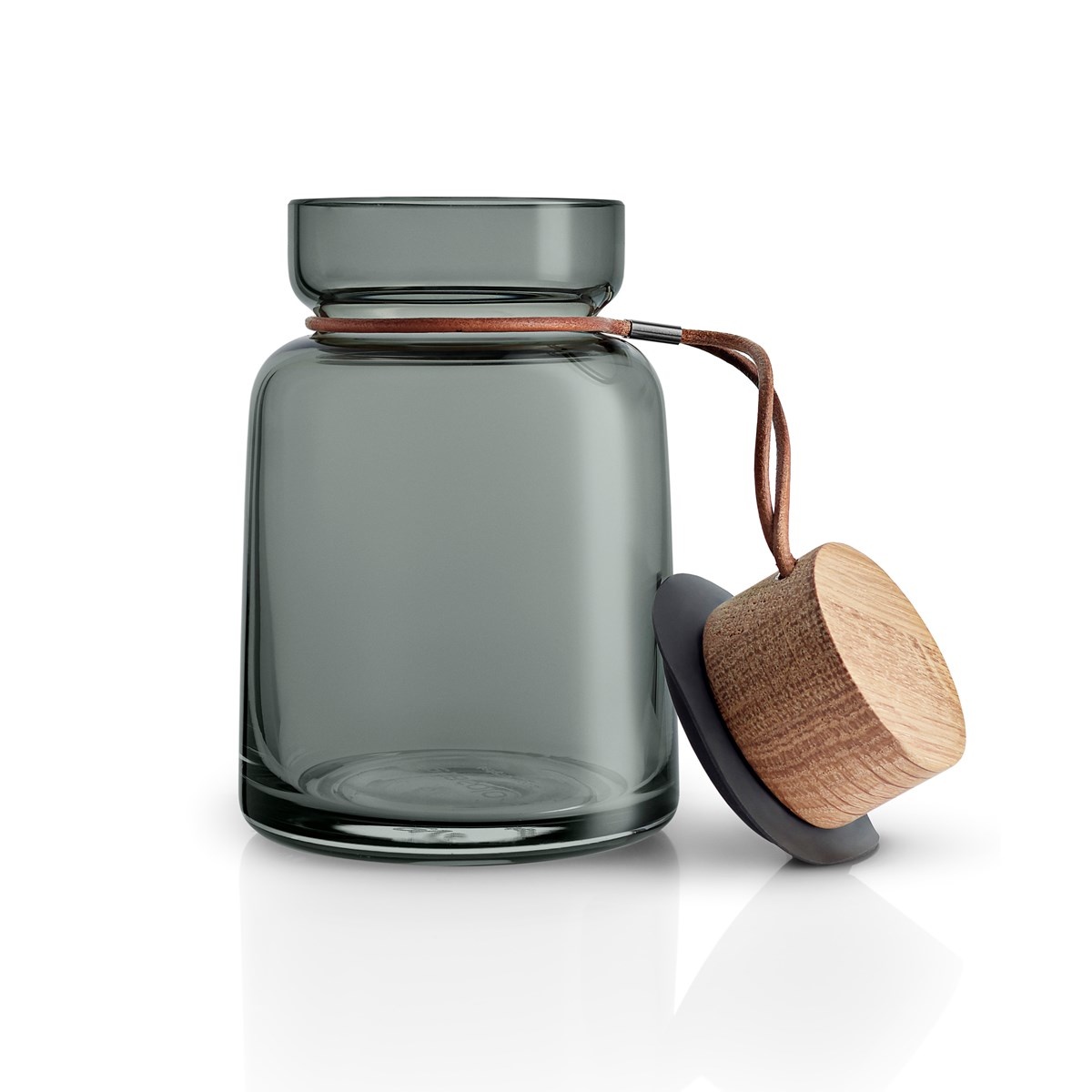 De voorraadpot is gemaakt van gerookt glas, eikenhout, siliconen en een lederen lus. Omdat het glas mondgeblazen is, is elke pot uniek en een echte blikvanger, zelfs zonder de inhoud. Het glas is vaatwasserbestendig. De deksel en de lederen lus zijn eenvoudig te reinigen met een vochtige doek.