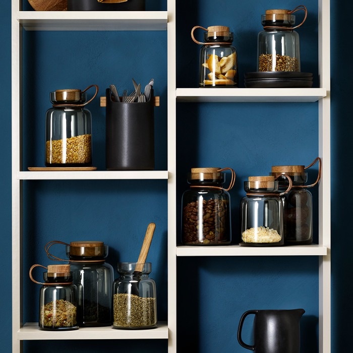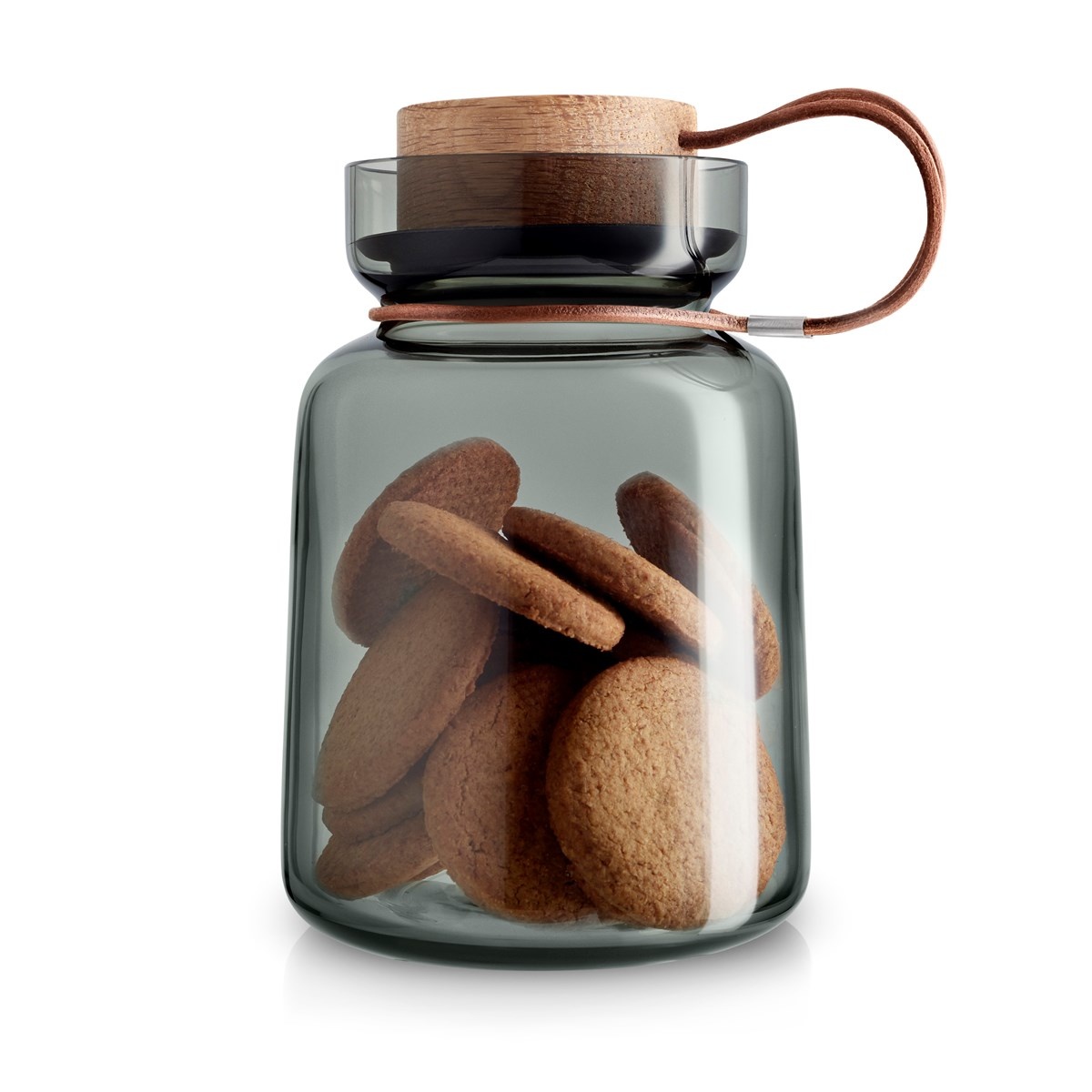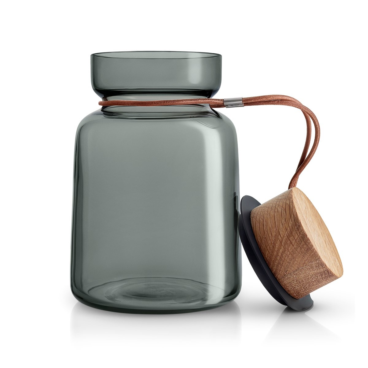 De voorraadpot is gemaakt van gerookt glas, eikenhout, siliconen en een lederen lus. Omdat het glas mondgeblazen is, is elke pot uniek en een echte blikvanger, zelfs zonder de inhoud. Het glas is vaatwasserbestendig. De deksel en de lederen lus zijn eenvoudig te reinigen met een vochtige doek.
