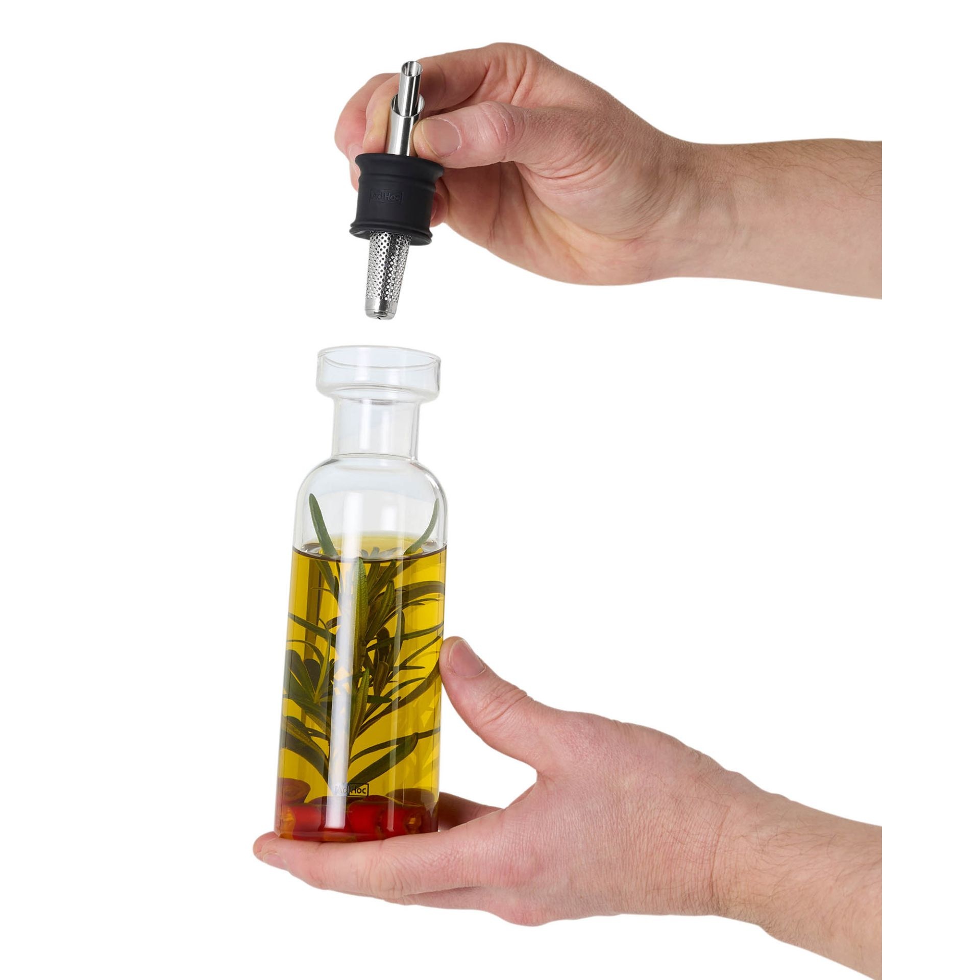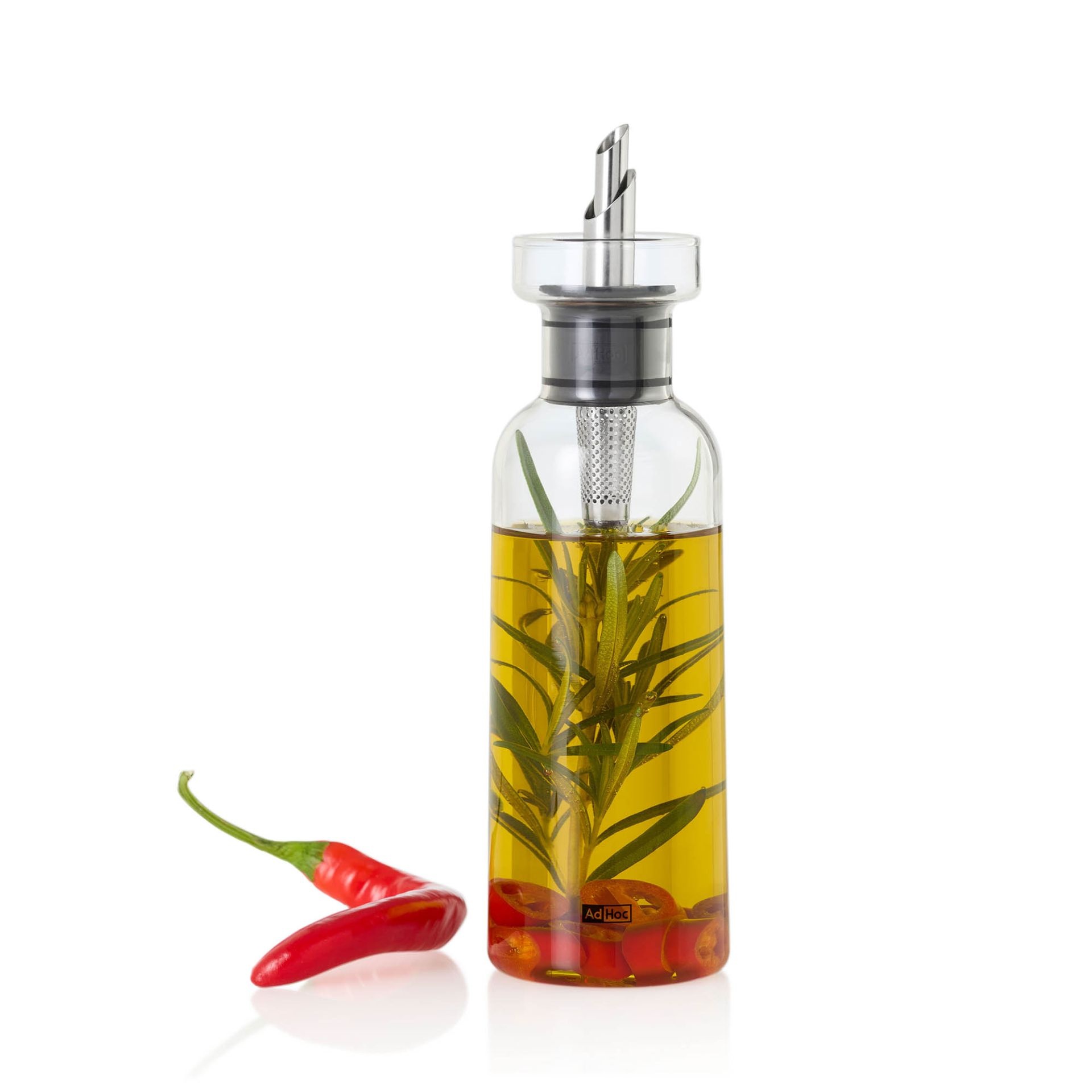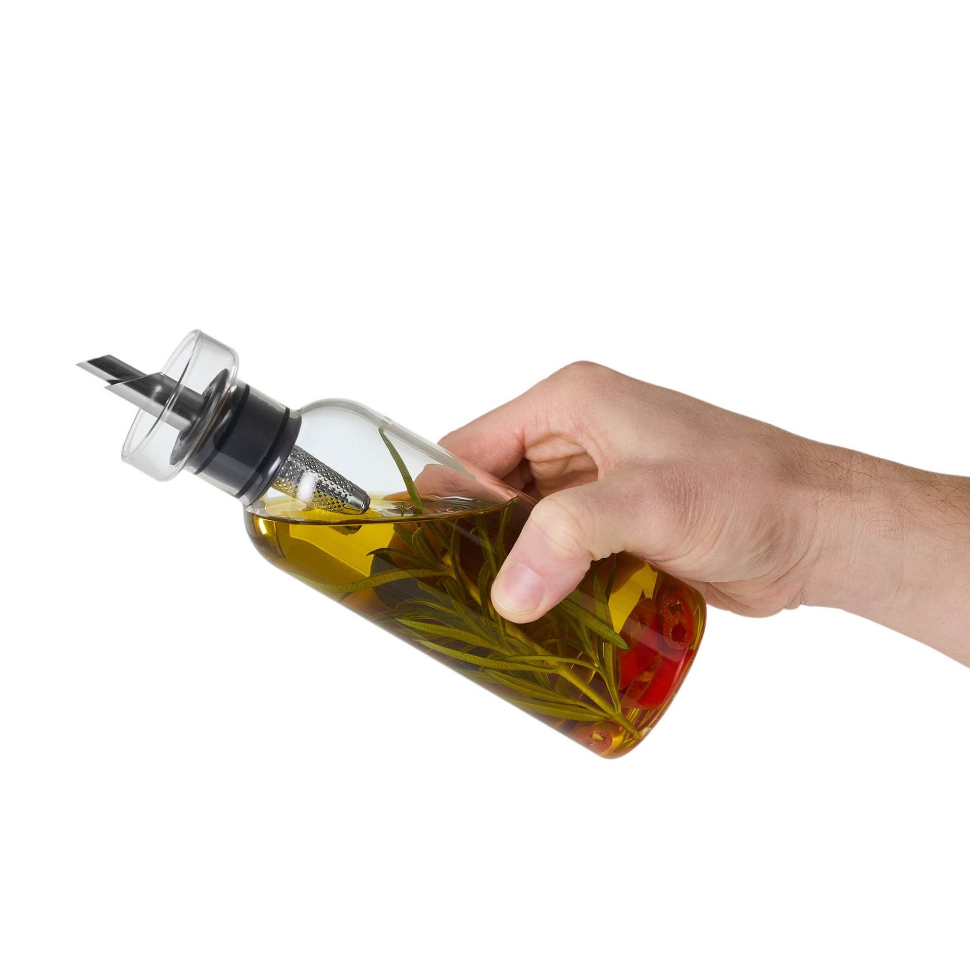 Kruiden, chilipepers en andere vaste ingrediënten worden tegengehouden door een roestvrijstalen filter aan de binnenkant. De container zelf is gemaakt van absoluut smaakneutraal, grijs getint borosilicaatglas en kan eenvoudig en schoon worden gevuld via de grote vulopening.