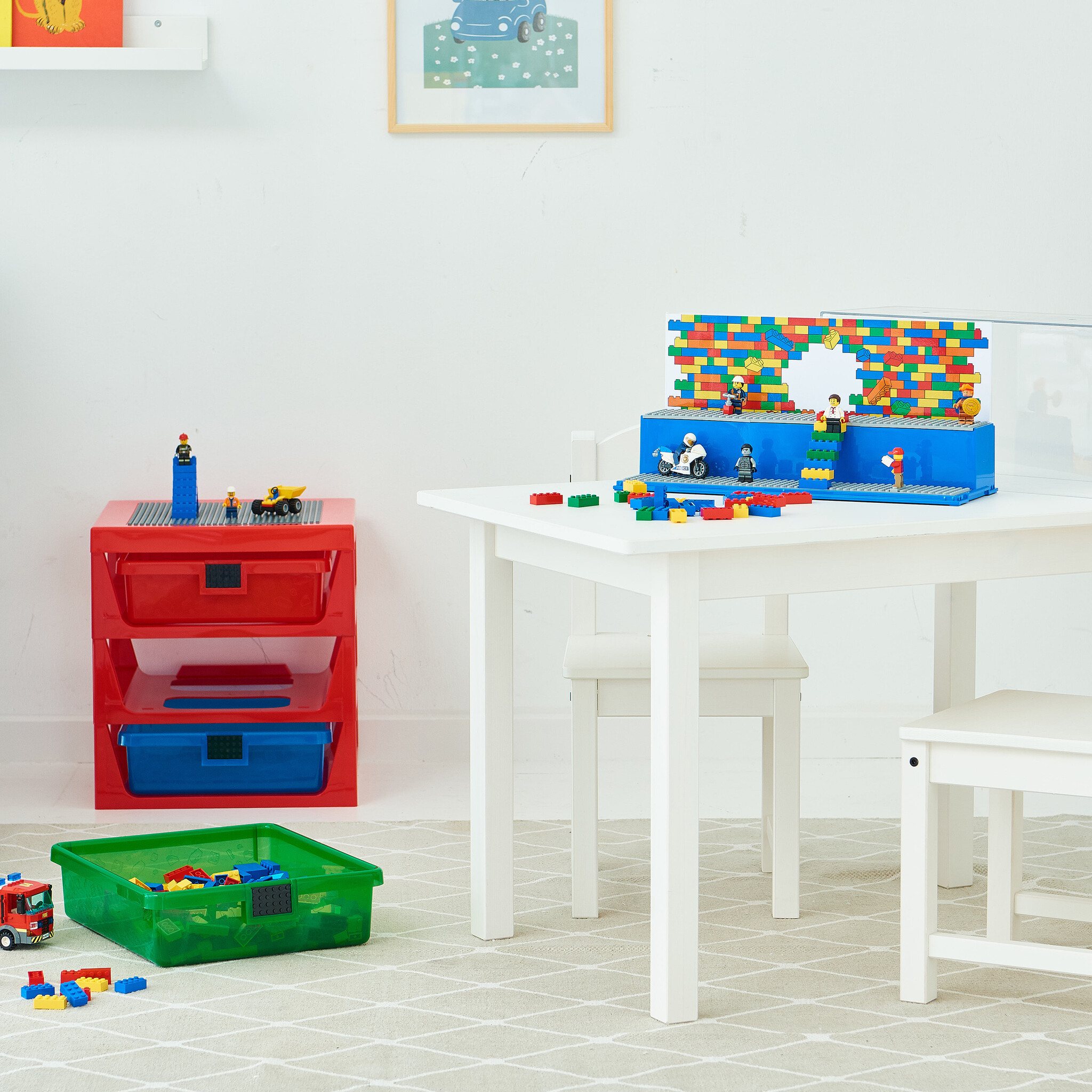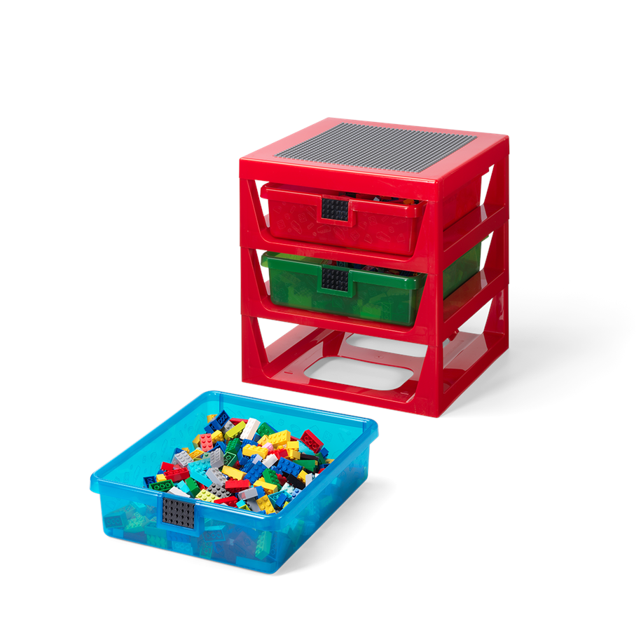 - Bevat 3 laden van doorzichtige rode, groene en blauwe kunststof. Elke lade is voorzien van een geïntegreerde LEGO® bouwplaat van 4x6 noppen waarop kinderen iets kunnen bouwen.